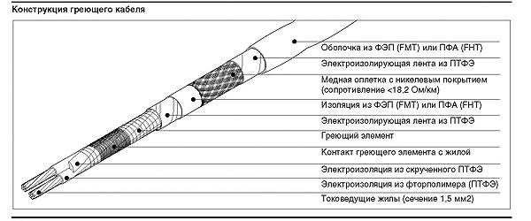 كبل التسخين الذاتي التنظيم لنظام إمداد المياه هو جهاز يتضمن مصدر تسخين مرن. إذا قمت بتقطيع أوصاله ، يمكنك أن ترى أن الكتلة الحرارية البلاستيكية يتم ضغطها حول الأوردة النحاسية المغطاة بسبيكة من القصدير والنحاس.