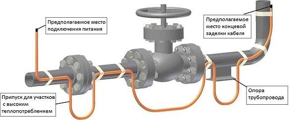 - لا تضع السلك في مناطق بها صنابير وصمامات إغلاق أخرى. بعد التثبيت ، من الضروري تقديم ملاحظة مقابلة تفيد بأن خط الأنابيب يتم تسخينه.