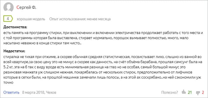 تبلغ تكلفة غسالة Samsung 22000 روبل. إنه مشابه في خصائصه للنموذج السابق. نفس حمولة 6 كجم وتحكم إلكتروني و 8 برامج غسيل. تكمن الاختلافات في سخان السيراميك المثبت والأسطوانة الماسية. بخلاف ذلك ، هذه غسالة ملابس يومية بسيطة إلى حد ما.