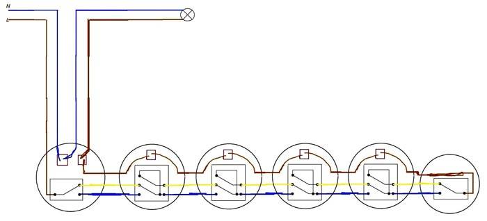 ولكن إذا كان مخطط توصيل المفاتيح من مكانين واضحًا ، فماذا إذا كان من الضروري التحكم من عدة نقاط؟ سنكتشف.