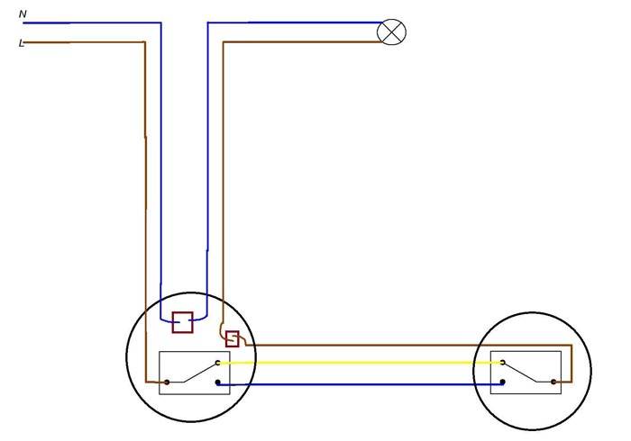 نصيحة مفيدة! عند وضع الكابلات لتركيب دائرة تبديل ثنائية المفاتيح ، يُنصح بتمييز الأسلاك التي تذهب إلى مصباح أو مصباح آخر. ليس من الصعب القيام بذلك بمساعدة الشريط الكهربائي الملون ، لكن مثل هذه الإجراءات ستوفر عليك من العمل غير الضروري في المستقبل.
