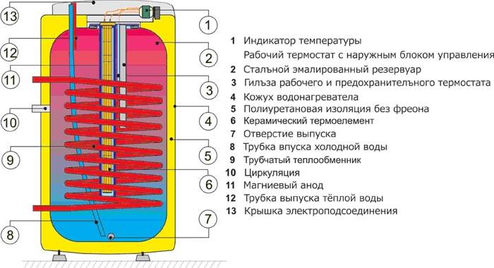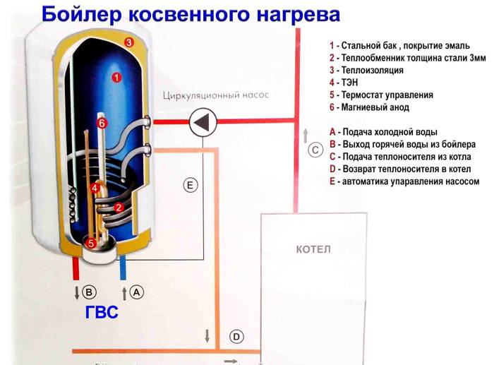 Особеността на котела за индиректно нагряване на вода е, че той не използва собствен източник на топлина. Загрява водата с помощта на външно устройство като котел или отоплителни радиатори.