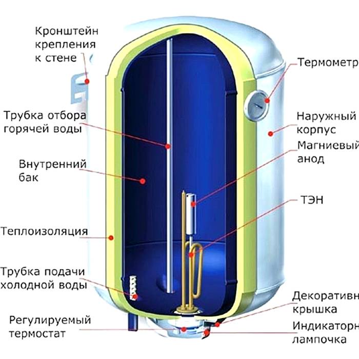 Може да има няколко или един нагревателен елемент - това зависи от обема на резервоара и дизайна на устройството. Термостатът отваря електрическата верига, когато температурата на съдържанието на резервоара достигне необходимите стойности.