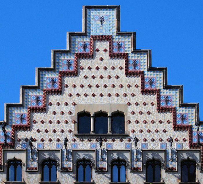 Стъпаловидната форма на фронтоните е необичайна за вътрешната архитектура, по-често се среща в европейските страни