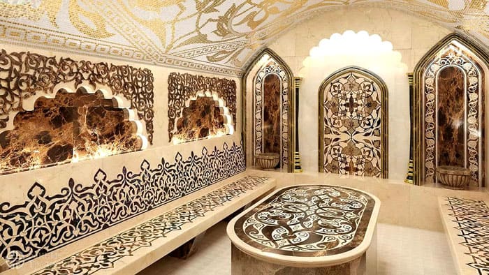 Хамамът не използва изцяло дървени покрития, както в сауната и други бани. Тук царуват камък, мрамор, плочки
