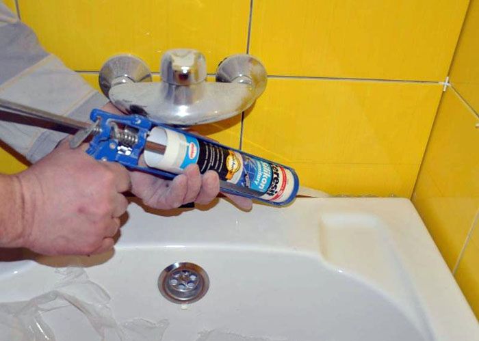 Wenn ein Dichtmittel oder Klebstoff auf die Badewanne gelangt, ist es besser, dieses Material sofort mit einem Schwamm zu entfernen. Wenn das Dichtmittel gefroren ist, wird es mit einer Klinge entfernt und durch eine Schicht abgeschnitten