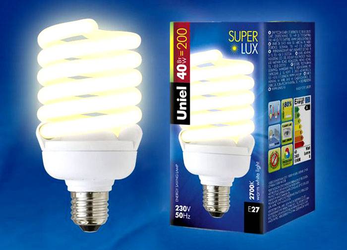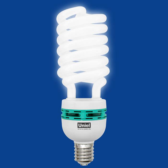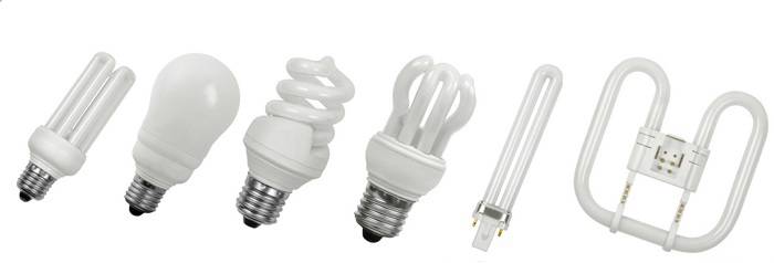 Der Name energiesparender Kompaktleuchtstofflampen ist auf ihr Design zurückzuführen. Dies sind Entladungszellen, in denen ein Strom und ein Inertgas, das etwas Quecksilberdampf enthält, zur Erzeugung von ultravioletter Strahlung verwendet werden. Diese Strahlen fallen auf den Leuchtstoff, eine Mischung von Pulvern an den Wänden des Kolbens, und werden in Licht umgewandelt.