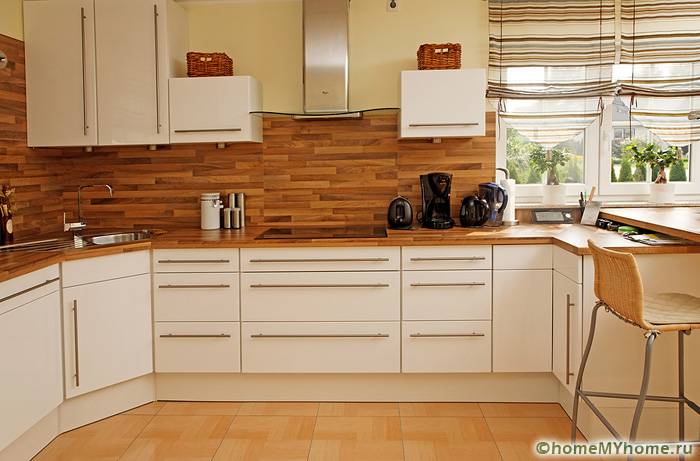 Diese Option ermöglicht die Verwendung von Holzpaneelen, die nicht schlechter als Gegenstücke aus Glas und Keramik dekoriert werden können und so umweltfreundlich wie möglich sind. Von den Minuspunkten können wir die Tatsache nennen, dass Küchenschürzen aus MDF leicht entflammbar sind und beim Verbrennen schädliche Substanzen abgeben.