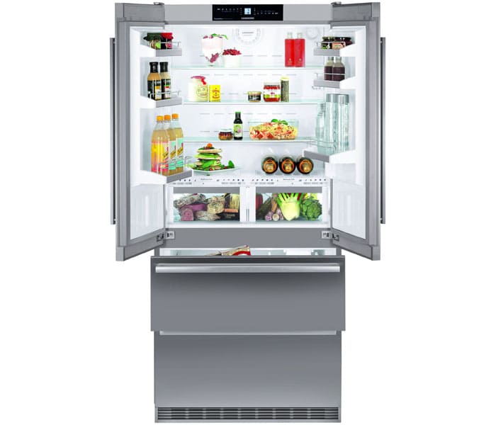 Die Hersteller haben die Möglichkeit vorgesehen, ein Modell zu kaufen, das den Klassiker und Side by Side ideal kombiniert. Dieses Modell des Layouts heißt "French Door": Das Kühlfach in ihnen hat zwei Türen, und darunter befindet sich bereits ein Gefrierschrank mit einer dritten Tür.