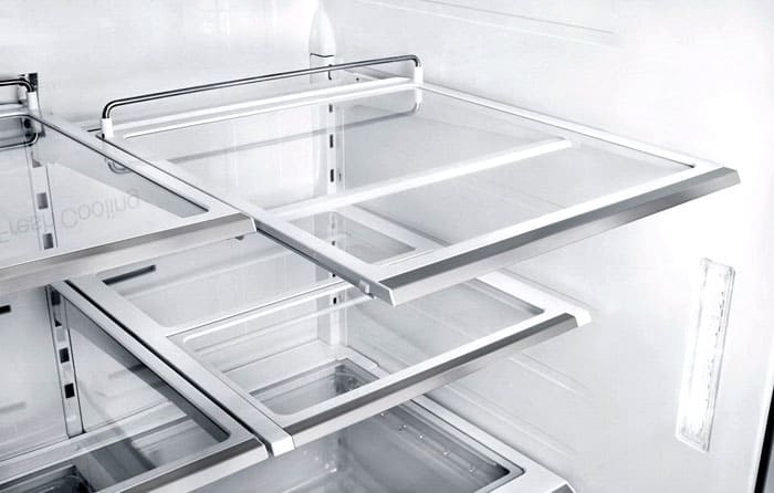 Die Glasböden sind leicht zu reinigen und die Metallböden beeinträchtigen die freie Luftzirkulation nicht. Dies hilft, die optimale Temperatur in der gesamten Kammer aufrechtzuerhalten. Der Nachteil solcher Gitterböden liegt in der freien Durchlässigkeit nicht nur für Luft, sondern auch für Flüssigkeiten, die aus den oberen Regalen verschüttet werden und die sicherlich andere Produkte beflecken, die sich auf dem Boden darunter befinden.