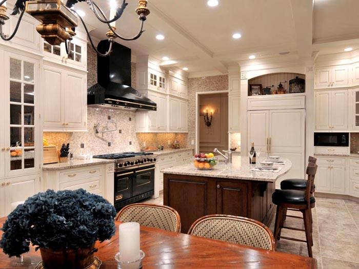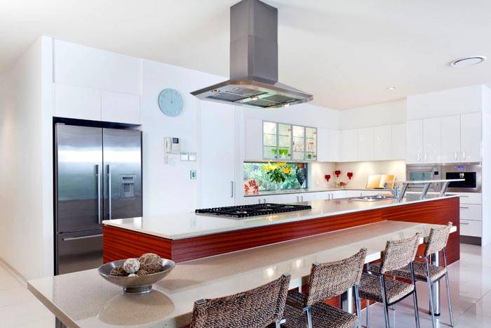 - Ostrovny. Die höchsten Kosten sind typisch für Installationsarbeiten. In der Mitte befindet sich eine Inseldeckenhaube für die Küche. Die Option ist für große, geräumige Zimmer relevant. Die Inselhaube ist an der Decke befestigt und mit dem vertikalen Kanal verbunden. Sie dienen oft als Designerküchendekoration;