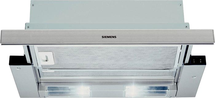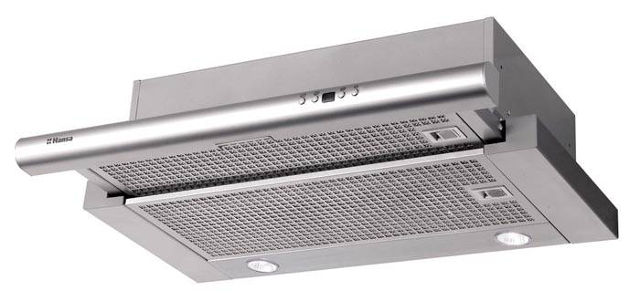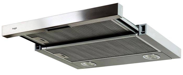 - Teleskopisch. Versteckt montiert. Während des Betriebs wird eine Platte mit Fettfiltern herausgezogen.