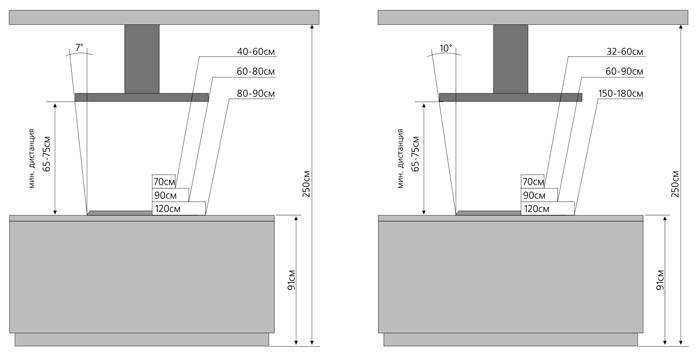 Es lohnt sich im Voraus zu entscheiden, in welcher Höhe die Haube aufgehängt werden soll. Der Wert hängt vom Plattentyp ab. Wenn für Gasgeräte der Mindestabstand 0,75 m beträgt, beträgt er für einen Elektroherd 0,65 m.