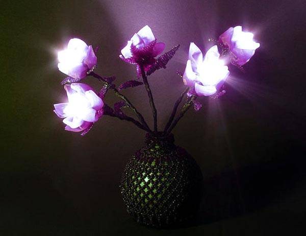 Glasfaserleuchten gelten als die sichersten. Glasfaser-Nachtlichter mit interessanter Beleuchtung verbrauchen ein Minimum an Energie, da die Glasfaser, aus der die Fasern bestehen, praktisch ohne Verlust Licht leiten und streuen kann. In solchen Nachttischlampen reicht manchmal nur eine LED aus, um eine helle Installation zu erzeugen, wenn die Zusammensetzung einfarbig ist.