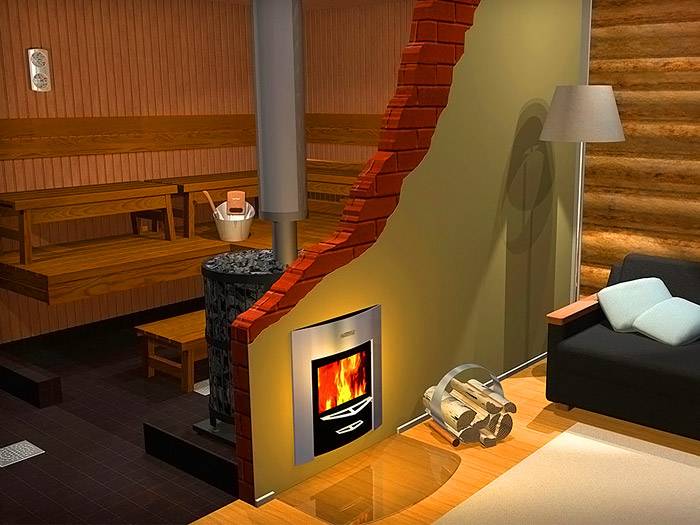 Solche Konstruktionen werden zur Ausstattung von Dampfbädern verwendet. Aber mit dem richtigen Design ist es in Mode, sie in die Gestaltung eines Wohnraums zu integrieren. Hier werden das schnelle Erhitzen des Metalls und die langfristige Erhaltung der Wärme durch Füllen mit Steinen erfolgreich kombiniert.