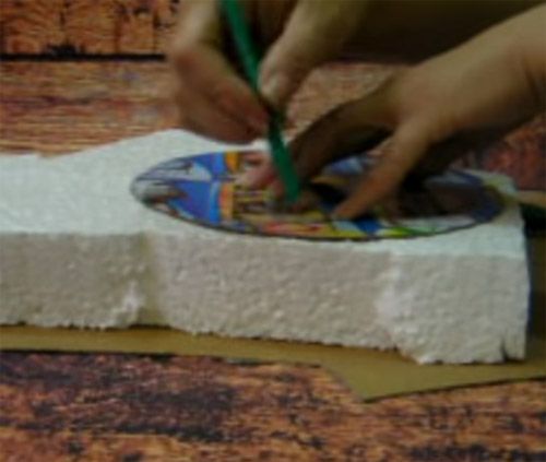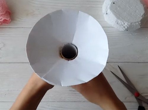 Schaumpfannkuchen werden mit Wellpappe dekoriert und mit Süßigkeiten überklebt. In der Mitte wird eine Pappröhre verwendet