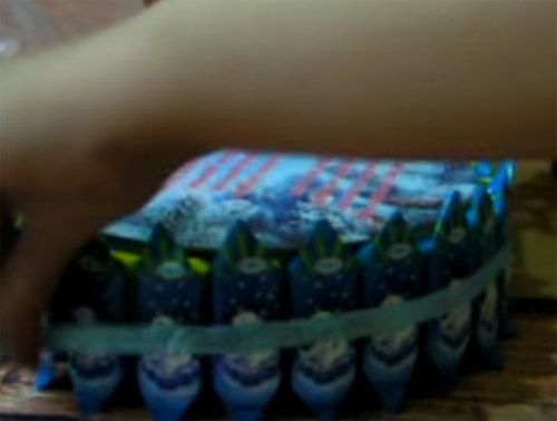 Zuerst werden die Süßigkeiten auf Klebeband oder Klebeband geklebt, das dann in Reihen um die Flasche gewickelt wird. Starten Sie den Vorgang von unten