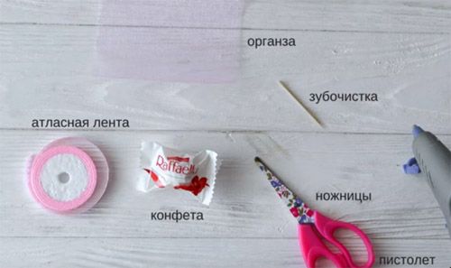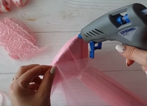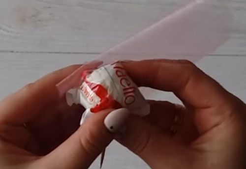 Tüll ist ein helles Material, es kann leicht helfen, ein Geschenk zu dekorieren. Schneiden Sie das Basisherz aus dem Schaum heraus, kleben Sie es mit Wellpappe und Geflecht über. Kleben Sie eine Reihe von Süßigkeiten mit Tüll darauf