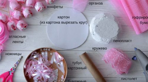 Für das Handwerk benötigen Sie Wellpappe, Bänder, die Lieblingssüßigkeiten der Frau und ein Dekor Ihrer Wahl.