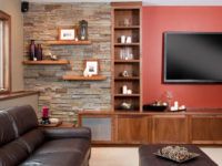 Wie die Praxis gezeigt hat und Fotos dies bestätigen, sehen Regale in Wohnräumen nur in Innenräumen optimal aus, in denen nur ein Minimum an anderen Möbeln verwendet wird. Das heißt, wenn das Wohnzimmer in einem minimalistischen Stil eingerichtet ist.