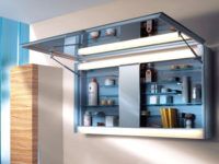 Die gleichen Regale wurden in Badezimmern und Küchen verwendet. Meist waren dies Glasstrukturen. Aber allmählich, mit dem Aufkommen neuer Anforderungen und Möglichkeiten, begannen sie, diese zugunsten offener Modelle loszuwerden. Das geschlossene Regal selbst besteht aus laminierte Spanplatte oder eine Massivholzkiste, die von vorne mit Glas bedeckt war: transparent oder gewellt.