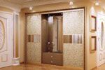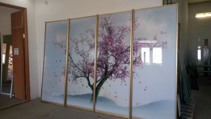 Zeichnungen in Fotoqualität werden mit speziellen Drucktechnologien erstellt. Verwenden Sie eine Basis aus Papier, Polymerfolie. Das fertige Produkt wird auf die Rückseite des Glases geklebt, wodurch die Fassade des Eckschranks im Schlafzimmer gut vor versehentlichen Beschädigungen geschützt wird.