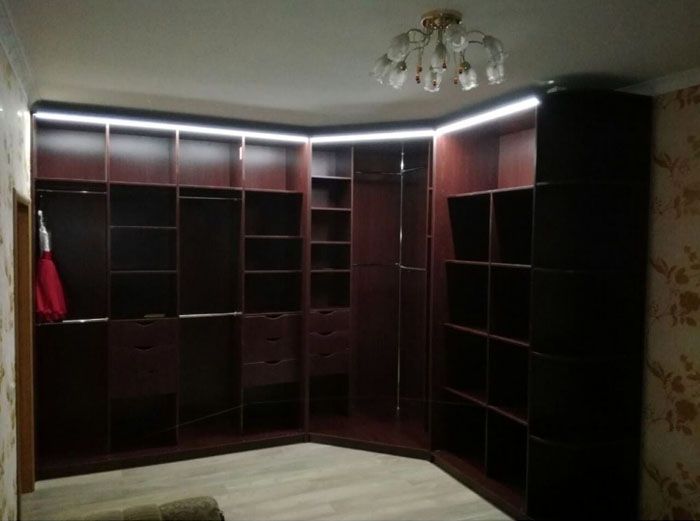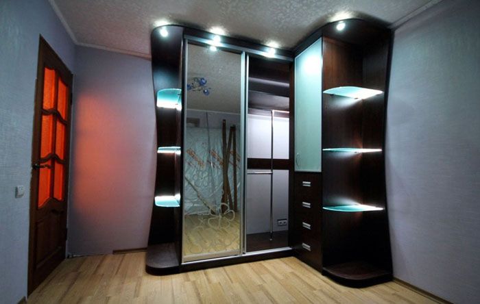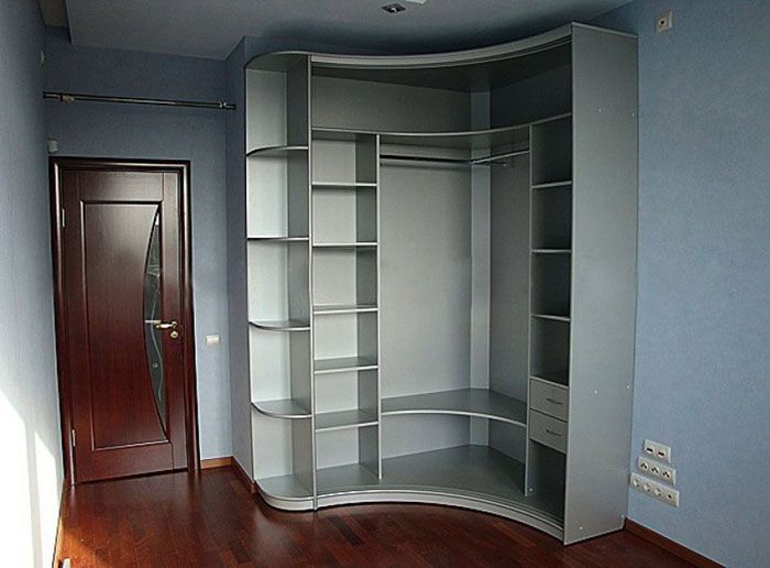 Bei Einbauten ruhen Teile des Eckschranks an Wänden oder Trockenbaumit denen sie getrimmt werden. Der Vorteil solcher Strukturen besteht darin, dass sie mobiler sind und weniger Zeit, Material und Aufwand für die Montage erfordern. Die Beständigkeit gegen mechanische Beanspruchung ist deutlich erhöht. Große Türblätter und externe Regale können ohne wesentliche Lastbeschränkungen installiert werden. Für ein perfektes Ergebnis benötigen Sie lediglich: