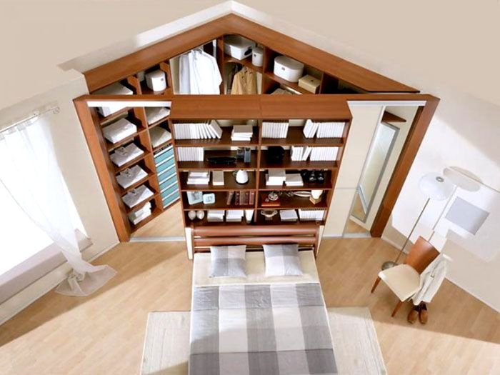 Das Diagramm zeigt, wie eine solche Lösung den Raum verändert, und selbst in einem relativ kleinen Schlafzimmer können Sie einen separaten Kleiderschrank erstellen. Der Vorteil solcher Strukturen ist die Installation der Kraftteile des Rahmens mit Unterstützung an den Wänden. Möbel werden in der Regel lückenlos vom Boden bis zur Decke verlegt. Auf diese Weise können Sie die Nutzung des gesamten Bereichs maximieren. Diese Nuance wird von praktischen Hausfrauen gemocht, die Staub in den angesammelten Rissen von Schranktüren und Regalen nicht wirklich gerne abwischen.