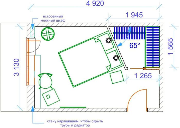 Nur einen freien Platz zu finden, reicht nicht aus, um Möbel richtig zu platzieren und bequem zu nutzen. Wenn Sie im Schlafzimmer einen großen dreieckigen Eckschrank installieren, sind die mittleren Regale zu tief. In den seitlichen verursachen scharfe Ecken Schwierigkeiten. Dieses Beispiel zeigt die Notwendigkeit einer umfassenden Bewertung von Größe und Form.