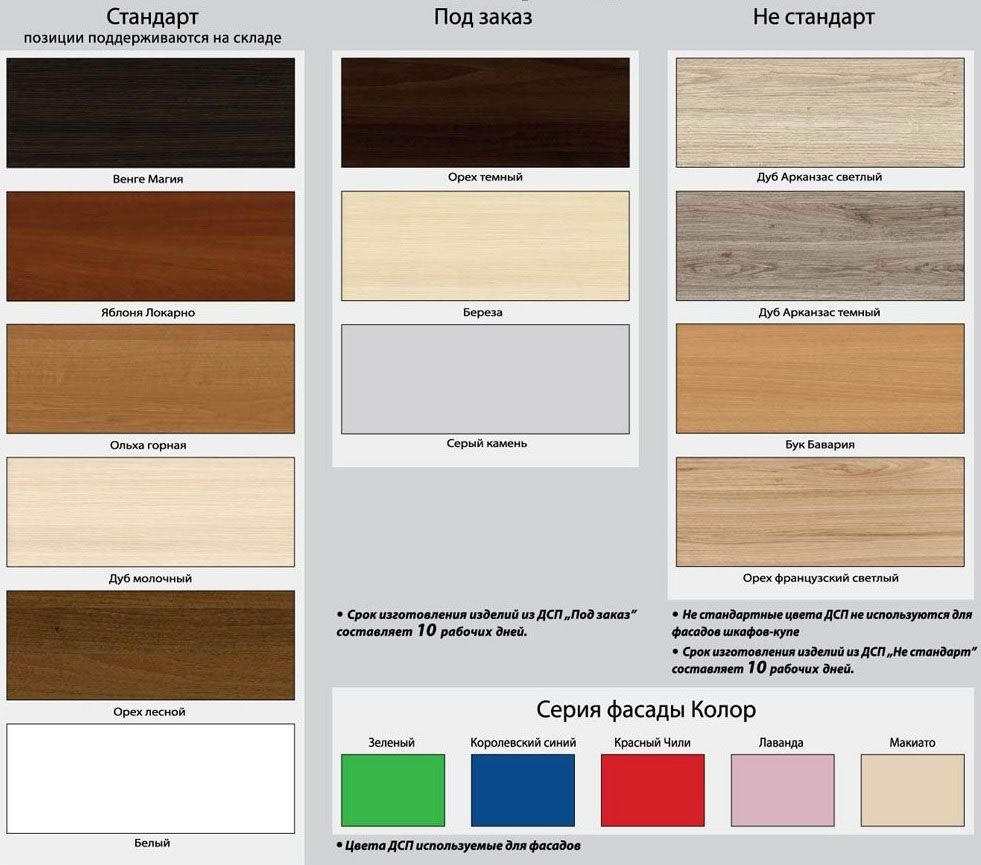 Regale und Seitenwände bestehen aus Spanplatten und MDF... Breite Plattenabdeckung laminieren oder Furnier. Endgeschützt mit Polymerauskleidungen. Wenn keine hintere Möbelwand vorhanden ist, ist die angrenzende Oberfläche der Gebäudestruktur mit wasserfester abwaschbarer Farbe bedeckt. Für die Herstellung von Fassaden werden verschiedene Materialien verwendet:
