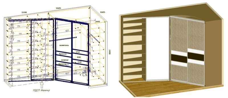 Das Eckdesign ist viel komfortabler. Die Rückwände des Schranks sind bereits fertig - das sind die Ecken des Raumes.Sie müssen nur noch die Regale anbringen, die Führungen für die eingebauten Schubladen installieren und die Rahmenelemente anbringen. In der Standardversion werden Schwingtüren mit Schienen verwendet.