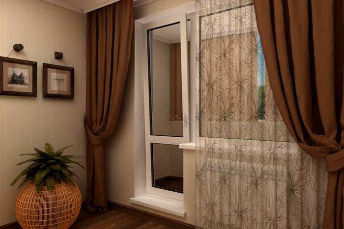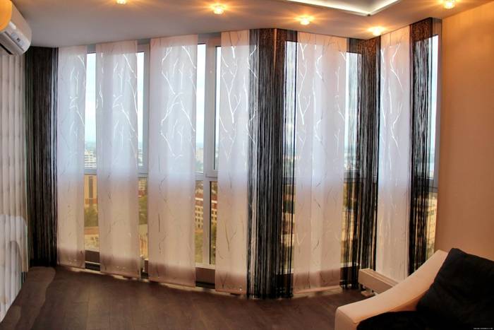 Überlegen Sie genau, ob das Zimmer einen Balkon hat. Es wird oft geöffnet, was eine gewisse Herausforderung für Textilien darstellt. Jalousien sind eine praktische Lösung. Gewöhnliche Schiebevorhänge reichen aus. Das Heben von Modellen in der japanischen Version hilft auch dabei, den Raum zu zonieren.