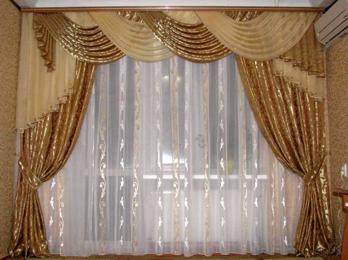 - Vorhänge mit einem Lambrequin sind nicht mehr so beliebt. Sie werden mit Ringen befestigt oder direkt am Gesims angebracht. Ideal für mehrstufige Decken und gestrichene Wände;