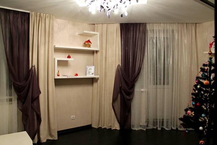 - Wenn sich die Fenster auf einer Seite befinden, verwenden Sie eine interessante Lösung - platzieren Sie einige der Vorhänge in der Mitte der Wand.