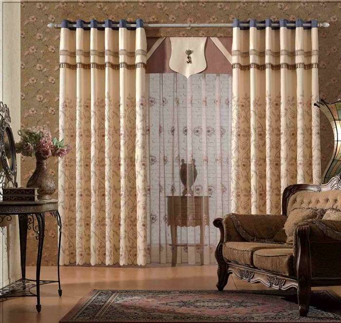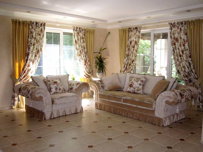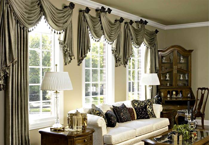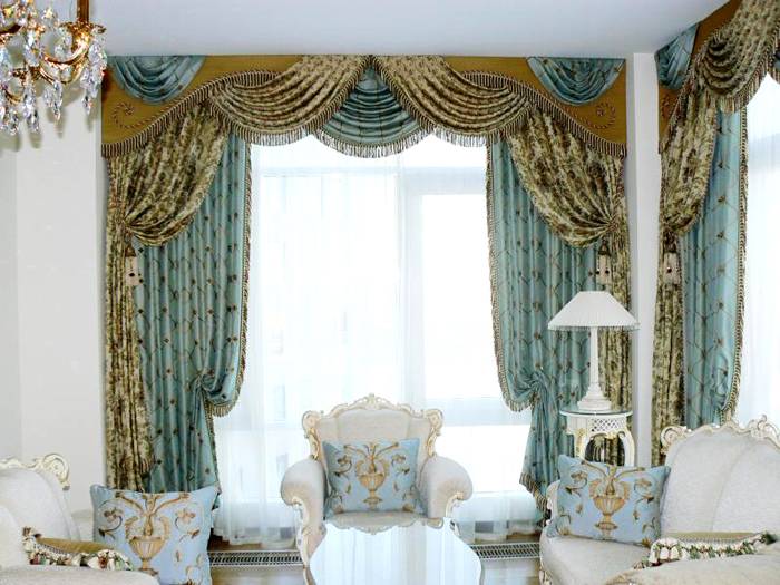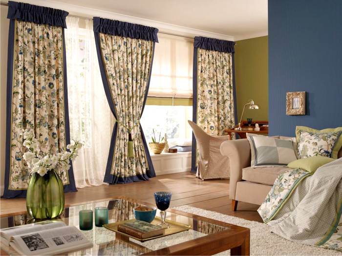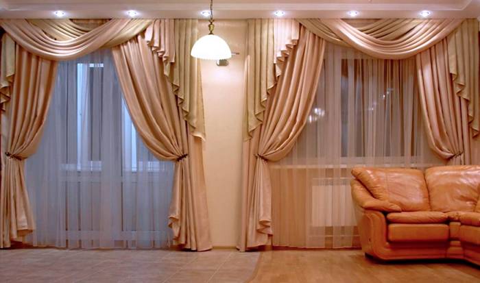 Es ist besser, Produkte aus dichten Materialien für das Wohnzimmer zu wählen. Beachten Sie bei der Auswahl von Produkten mit Lambrequins, dass die Farbe dieses Elements dunkler ist als die des Hauptprodukts. Beim Nähen von Vorhängen wird auch eine Kombination mehrerer Stoffe verwendet. Satin, Seide oder Wiederholungen werden mit Samt und Organza kombiniert.