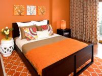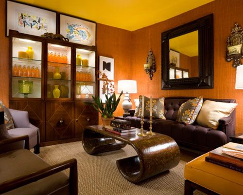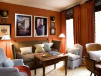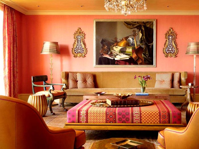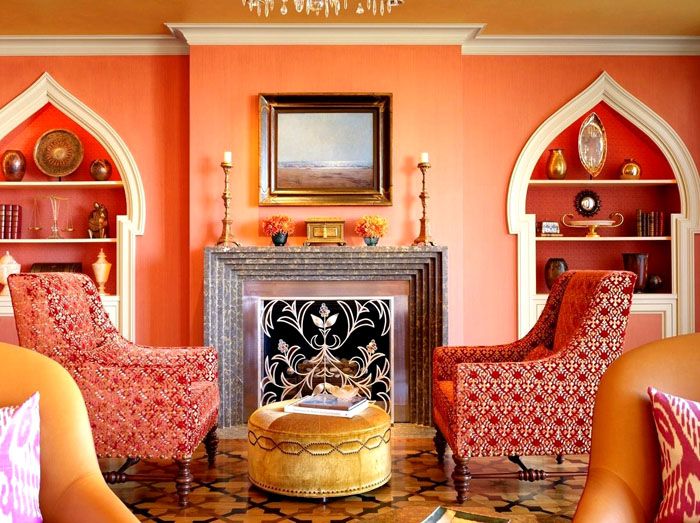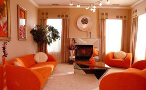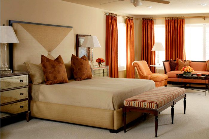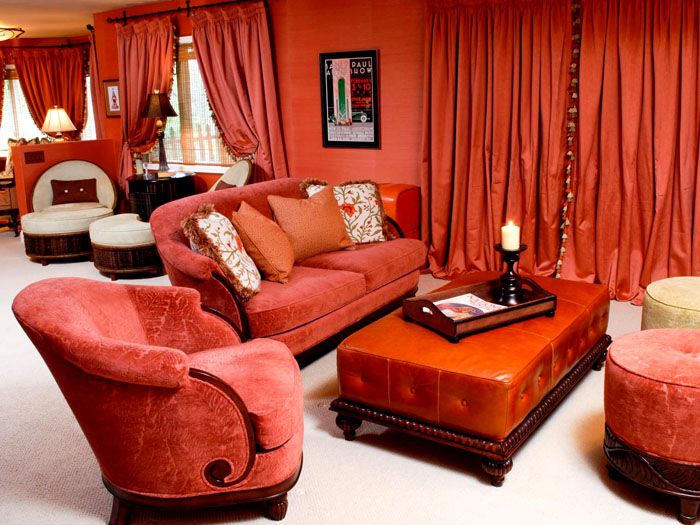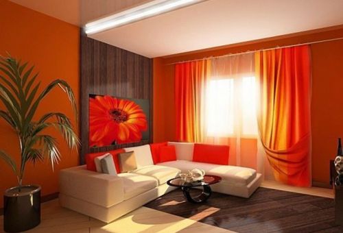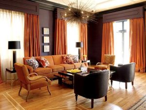 Vorhänge, Tagesdecken, Polster von Sofas und Stühlen - all dies in warmen Orange-Brauntönen wird sehr warm und gemütlich aussehen. Lassen Sie sich nicht auf eine feste Farbe hängen. Ornamente und Muster schmücken den Innenraum mit schlichten Wänden. Hier muss man wählen: entweder die Zeichnung an den Wänden oder an den Vorhängen.