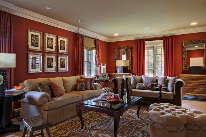 Die dunklen Farbtöne der ausgewählten Farbe eignen sich für große Räume wie z Wohnzimmer... Sie verleihen dem Raum Wärme und Komfort. Sie werden diesen Bereich zu schätzen wissen, wenn Sie haben Eckanordnung des Wohnzimmers und an Winterabenden ist es oft kühl. Wenn sich Ihr Wohnzimmer im Haus befindet, können Sie es sich leisten KaminMit Naturstein veredelt, passt es gut zur Hauptfarbe.