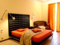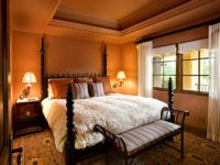 Licht Schlafzimmer sorgt für einen angenehmen Aufenthalt, aus diesem Grund sollten hier die hellen Terrakottatöne verwendet werden. Ruhige Töne eignen sich für Wände, dies ist eine der erfolgreichsten Optionen. Vor diesem Hintergrund können Sie dunkle Möbel anordnen und helle Textilien verwenden: Vorhänge, Kissen, Tagesdecke.Vor einem hellen Terrakotta-Hintergrund sieht ein geschnitztes Kopfteil aus Naturholz und verschiedene Kleinigkeiten in Kontrastfarben großartig aus: Vasen, Lampen, Fotorahmen.
