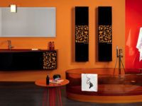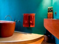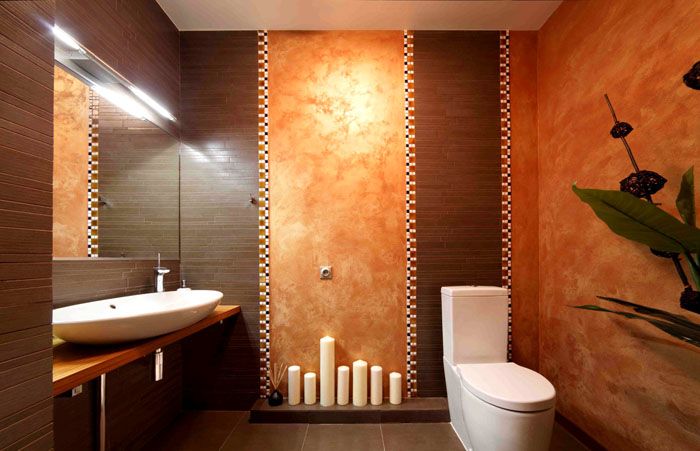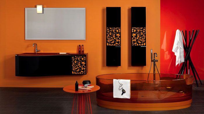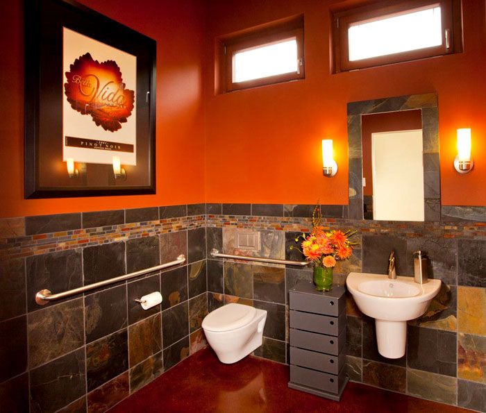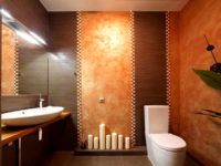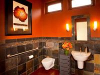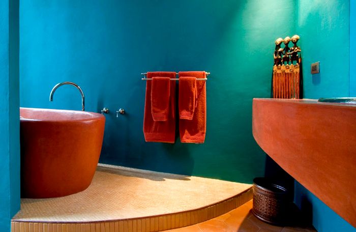 Warum nicht? Ziegelrot sieht in einer Komposition mit weißen Fliesen und Chrominstallationen gut aus. Sie können es nicht als Hauptfarbe verwenden, sondern in hellen Details: Handtücher, Spiegelrahmen oder Ornamente. Die Ziegelfarbe passt organisch in die Moderne Interieur im Loft-Stilund weichere Töne schmücken das Vintage-Design.