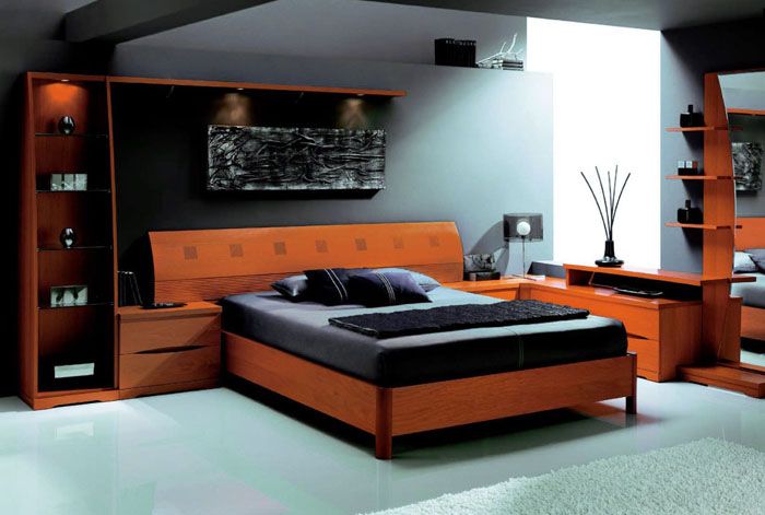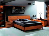 Eine interessante Idee für die Gestaltung von Schlafzimmern ist die Verwendung von Hellgrau in Kombination mit Terrakotta. In Anbetracht der Vielseitigkeit der Farben können Sie weiße Möbel im Schlafzimmer anordnen. Eine kleine Vergoldung bringt Luxus. Beispiele für ähnliche Schlafzimmer auf dem Foto.