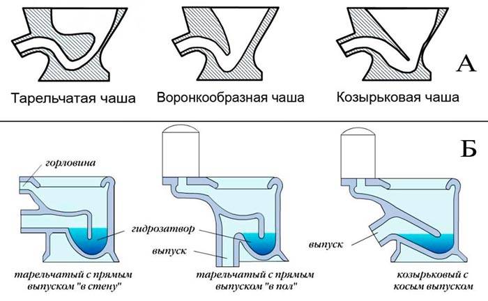 Alle Toiletten sind bodengestützt und hängende Modellesind über einen speziellen Abschnitt der Rohrleitung mit dem zentralen Steigrohr verbunden. Es bildet eine hydraulische Abdichtung, die Abflüsse in das Abwassersystem frei zulässt, aber die Rückführung unangenehmer Gerüche verhindert. Seine komplexe Form kann ein Hindernis für die Bewegung großer und fester Objekte werden.