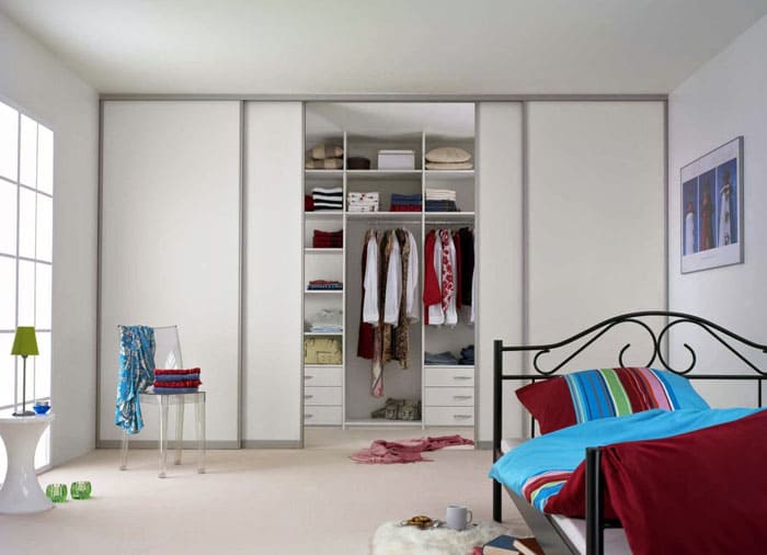 С гардероба е по-трудно: трябва да разделите рафтовете. Но като опция можете да си купите две отделни еднакви секции и да ги поставите до или в различни страни на стаята.