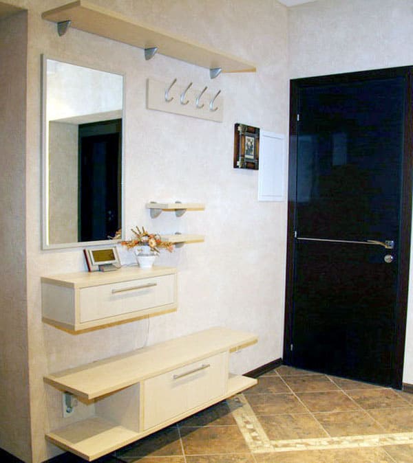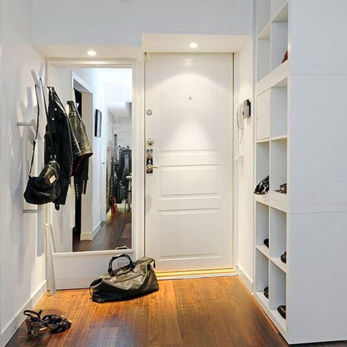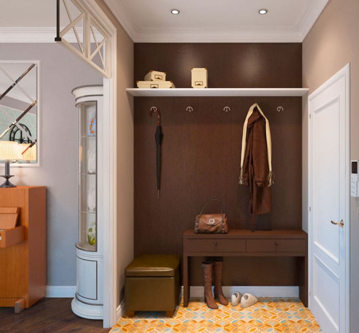 В квадратния коридор пространството се разпределя по-ергономично. Има място за закачалка с куки на едната стена, можете да сложите рафт за обувки, а до него е нощно шкафче с огледало. Гардеробът ще се побере от другата свободна страна.