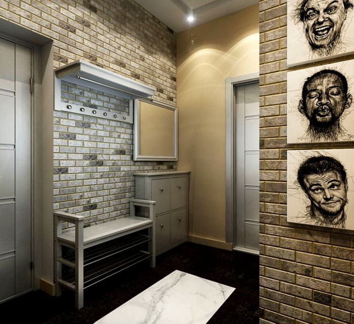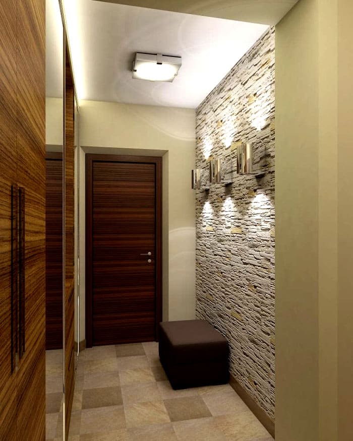Могат да бъдат изправени стени близо до входа изкуствен камък, тухлени плочки. Гипс също изглежда красиво в малък коридор, както и тапети. Но пластмасовите панели не се използват много често в апартаментите в това пространство.
