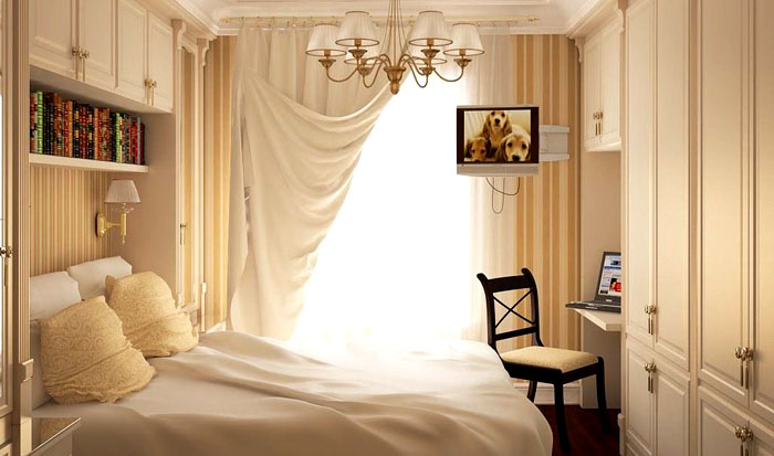 Тесната спалня има предимството, че едната й страна е идеално заета от мебели като гардероб, стелажи... Всичко това може да бъде разположено до прозореца или вратата, но във всеки случай мястото за съхранение е разположено около отвора.