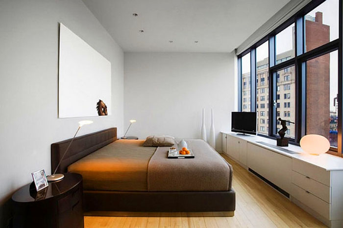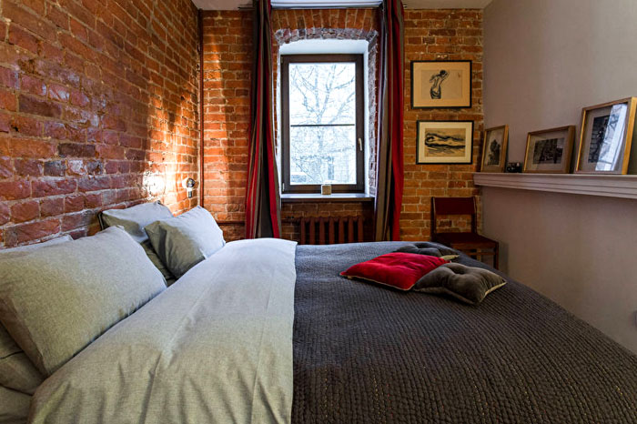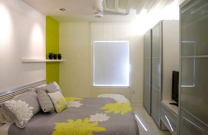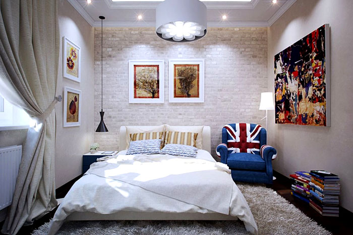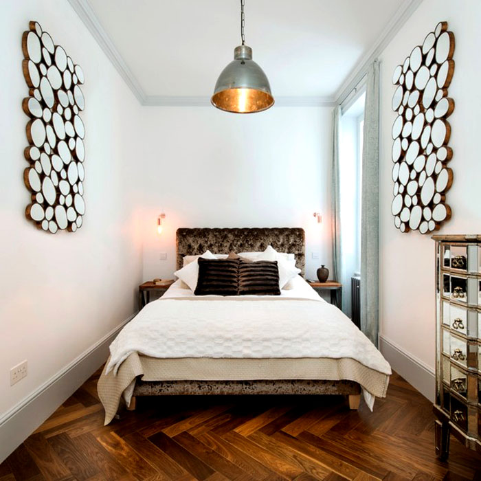 Тесното пространство може да се разшири визуално чрез окачване на ярки аксесоари на противоположните стени и поставяне на леглото в центъра