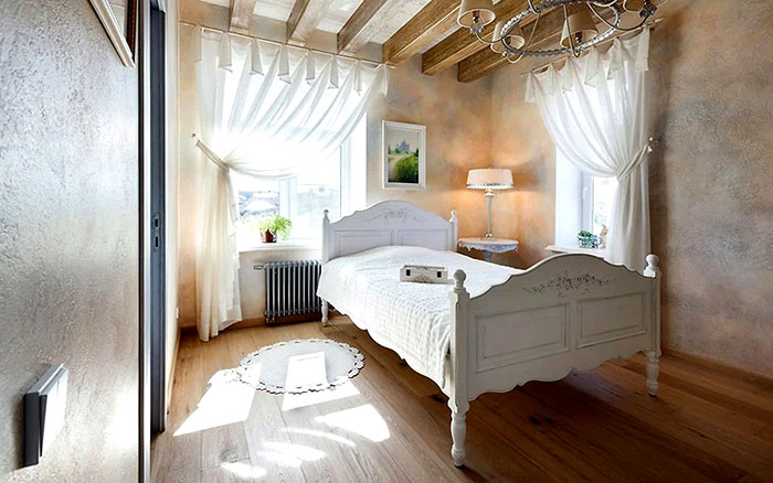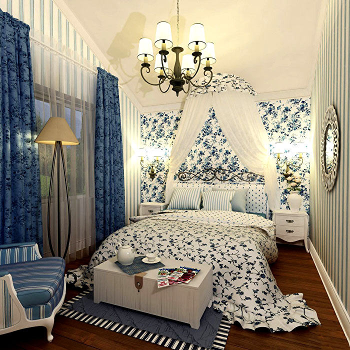 Спалнята в стил Прованс трябва да бъде ефирна, нежна, с нотка на южнофренска игривост. Това е създадено от флорални щампи, бели и сини тонове, люлякови и леко ментови нюанси.
