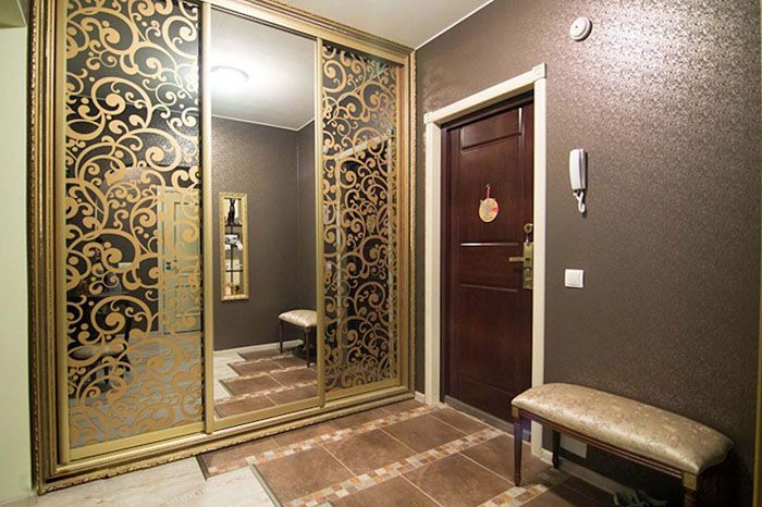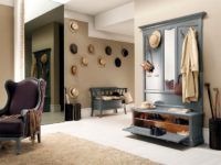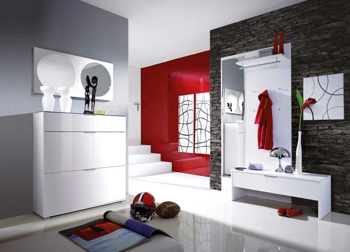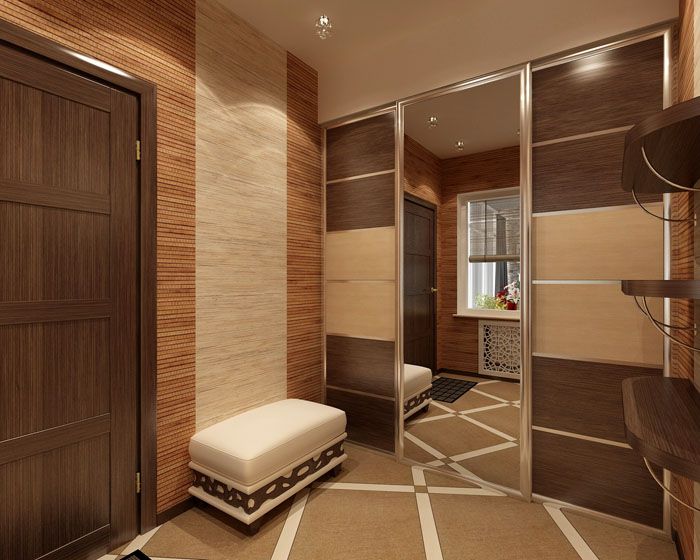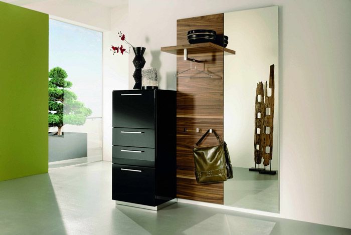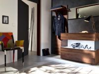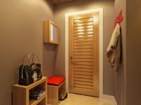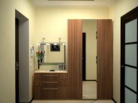 Всяка входна зона трябва да има необходимите атрибути: шкаф за съхранение връхни дрехи и обувки, огледало, пейка за обувки. Трудно е да се откажете дори от един от тези елементи. В оформлението на голямата зала можете да предвидите разграничаване на зоните с помощта рафтовете или дивани. За малък коридор е логично да се използва мебеликоето заема минимум свободно пространство.
