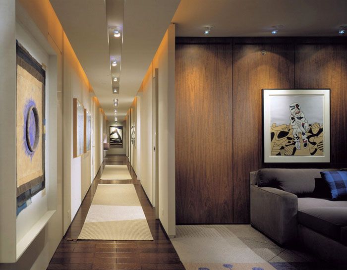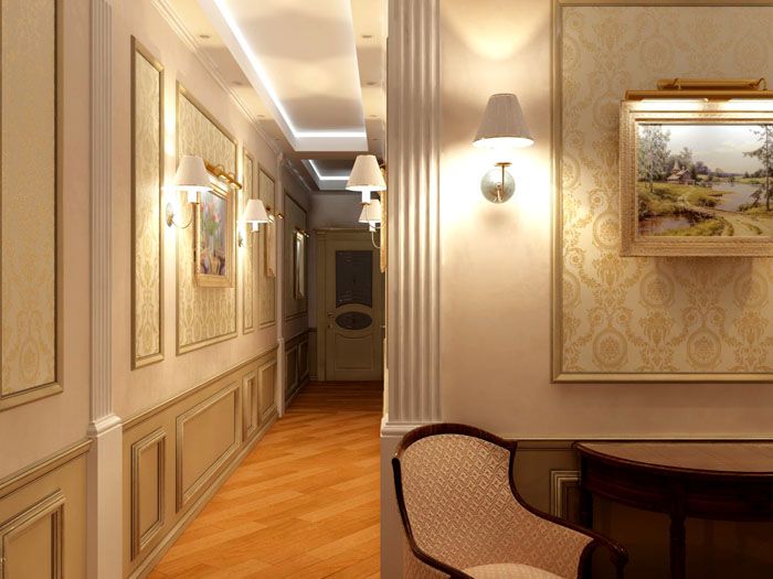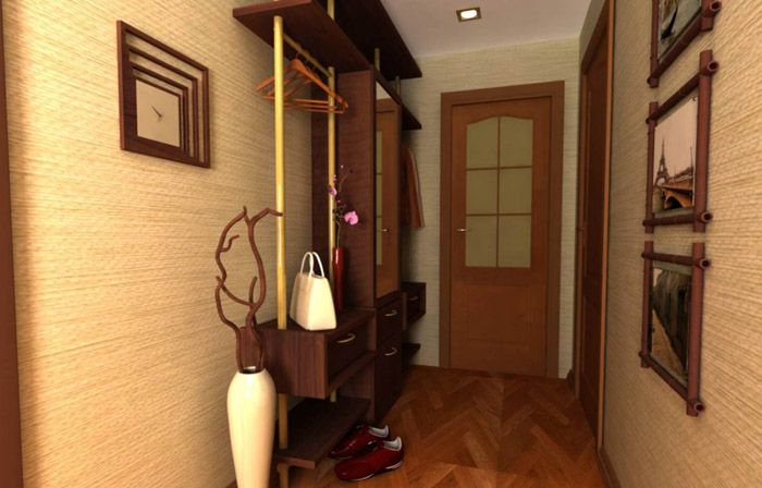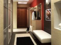 При проектирането на дълъг коридор не можете да използвате техниката на хоризонтално разделяне на стената. Атмосферата в такава стая трябва да бъде минимална. Колкото по-малко шкафът намалява ширината на коридора, толкова по-добре.