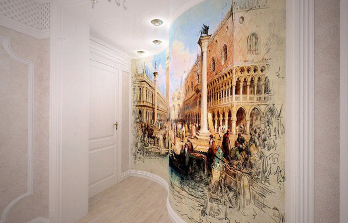 - Фреска. Неочаквано и оригинално решение е използването на стенописи в дизайна на скромна зона на коридора. Ако изберете правилния чертеж, стенописът визуално ще разшири стаята, ще създаде перспектива и ще отклони вниманието от тесното пространство.